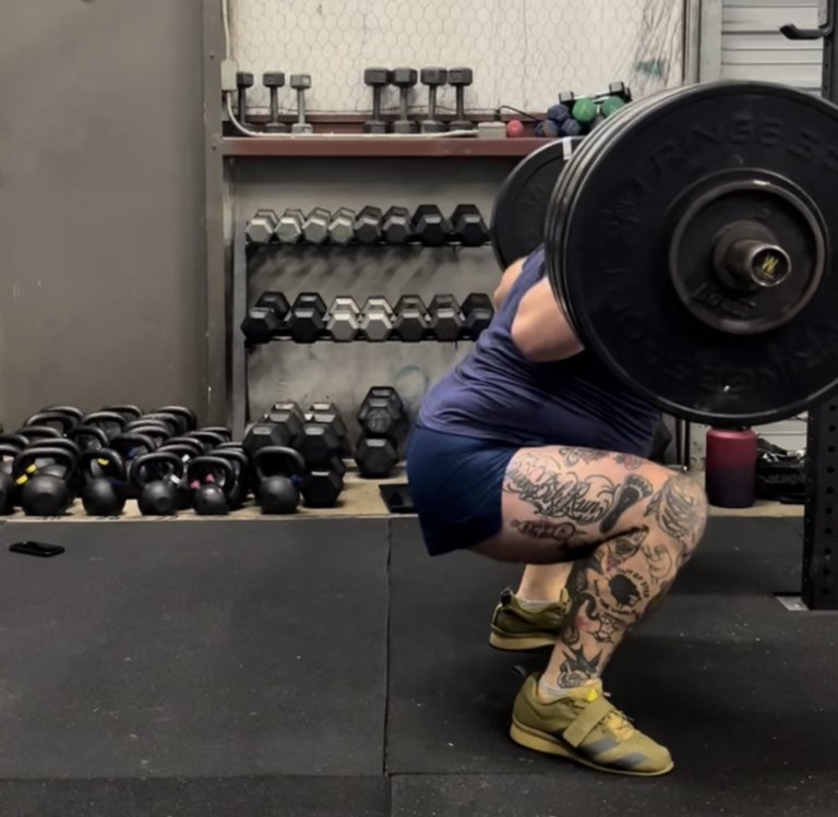 Weighing the weights and initialing took much longer than anticipated, given we needed to have Amanda (Walsh) run back home to grab a different scale, so I had cooled down more than desired before my first attempt. Regardless, after 10 minutes of weighing weights (I want to reiterate, all our weights weigh what they say they do), I settle in for my first attempt at bench press. Coach Jen, despite lifting in her own preparation for competition, very graciously offered to spot me. While it wasn’t my best lift, I got 255 down and up without much issue. I was really pleased, as that was a 10 lb PR. That said, I knew that I had done all I could do, and we turned off the camera. Had I wanted to attempt it again, we would have needed to reweigh all the weights. So… That was NOT going to happen. At this point, the question became, “What’s 1000 – 255?” Ok, I just need to lift 745 between squat and dead. Well… My PR squat is 345 and my PR dead (from 18 months ago) is 425… I should be able to do this if my squat holds up.